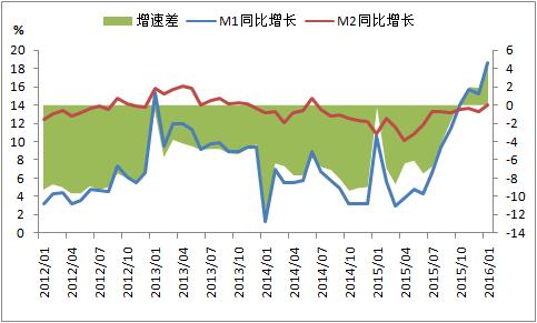 2016年1月末,M1和M2分別同比增長(zhǎng)18.6%、14%,增速較上月同期提高3.4和0.7個(gè)百分點(diǎn)。其中,M2增速攀升,主要是信貸投放帶動(dòng)派生存款大幅增加。M1增速攀升,主要是1月份央行通過(guò)開展逆回購(gòu)、MLF、SLF等多元化貨幣政策工具向市場(chǎng)凈投放逾萬(wàn)億元基礎(chǔ)貨幣。