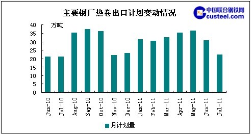 從目前國(guó)內(nèi)外發(fā)展形勢(shì)來(lái)看,7-8月份出口市場(chǎng)仍不太看好,預(yù)計(jì)鋼材出口形勢(shì)好轉(zhuǎn)將有可能在三季度末也就是9月份以后體現(xiàn)。以熱卷為例,本網(wǎng)調(diào)查結(jié)果顯示,17家主流熱卷鋼廠(chǎng)7月計(jì)劃出口量為22.3萬(wàn)噸,與上月相比減少了8.3萬(wàn)噸,環(huán)比下降了27.1%,降幅比上月擴(kuò)大10.9個(gè)百分點(diǎn)。