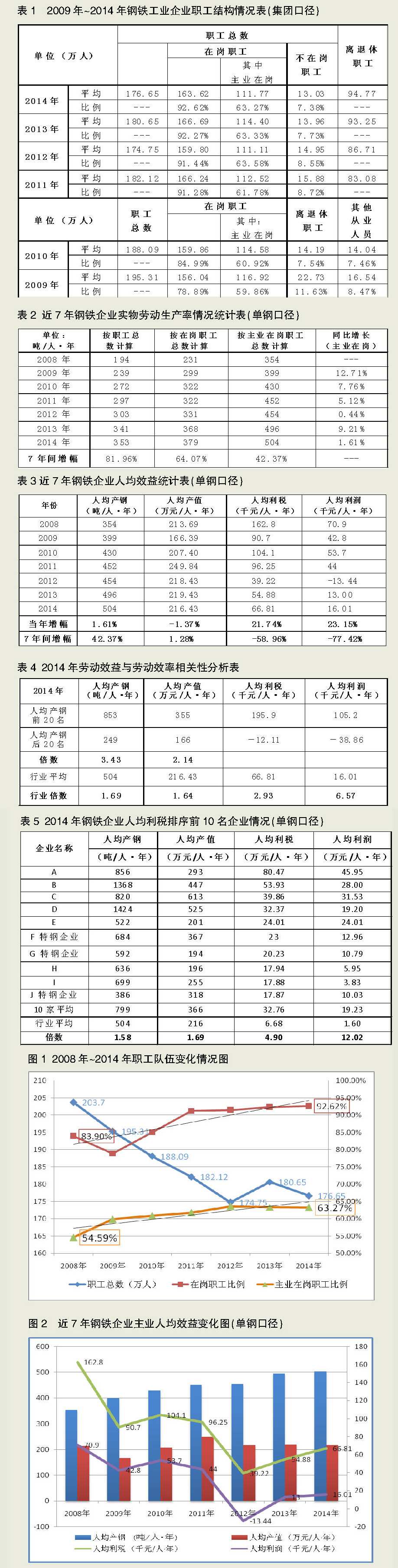 表2顯示,2014年,按單鋼口徑計算,會員企業(yè)生產(chǎn)粗鋼總量為5.64億噸,按職工總數(shù)160萬人計算,則人均年產(chǎn)鋼約為353噸;按在崗職工149萬人計算,則人均年產(chǎn)鋼約為379噸;按主業(yè)在崗職工112萬人計算,則人均年產(chǎn)鋼約為504噸。從2008年到2014年的7年間,按職工總數(shù)、在崗職工人數(shù)、主業(yè)在崗職工人數(shù)計算,實物勞動生產(chǎn)率分別增長了81.96%、64.07%、42.37%。數(shù)據(jù)充分顯示,鋼鐵行業(yè)人力資源工作者通過積極的人力資源結構優(yōu)化工作,實物勞動生產(chǎn)率明顯提高。